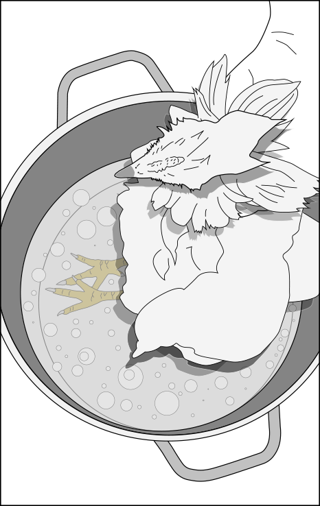 - Tirez la peau à la base du cou et coupez-la (ill.1). Passez votre doigt à travers l’ouverture ainsi pratiquée et déchirez la peau jusqu’en bas (ill.2 et 3).