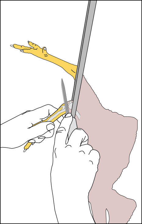 Faites pénétrer la lame par l’ouverture cloaquale et faites-la ressortir vis-à-vis de la pointe du bréchet (sternum). Tranchez ensuite vers le haut pour ouvrir complètement la cavité pelvienne.