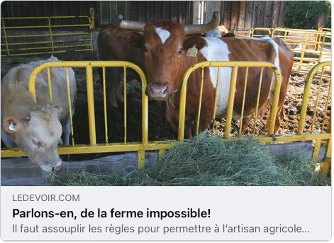 Vous rêvez d’exploiter une petite ferme familiale où vous éléveriez 2 vaches pour leur lait, 200 poules pour leurs oeufs et 500 poulets pour leur chair ? Abandonnez votre rêve ! Au Québec, les lois qui régissent la production et la mise en marché des produits agricoles (plans conjoints, quotas, agences de vente…) sont autant d’entraves au démarrage d’une telle entreprise.